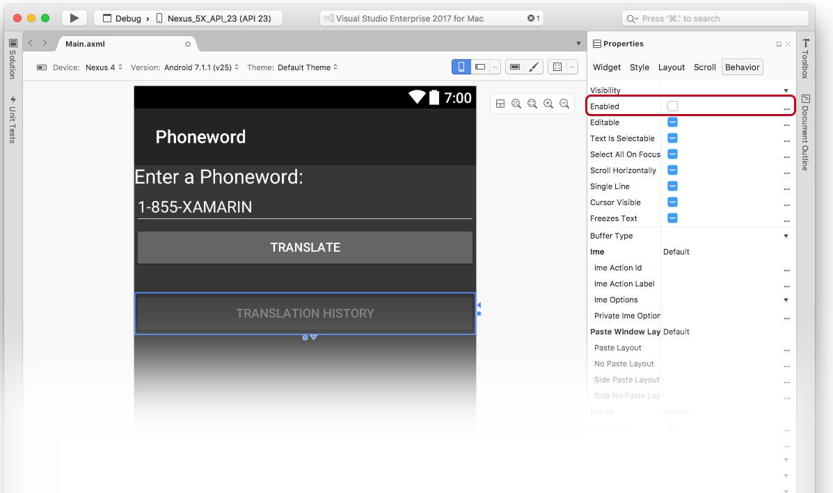 Start by opening the Phoneword project in Visual Studio for Mac and editing the Main.axml file from the Solution Pad.
