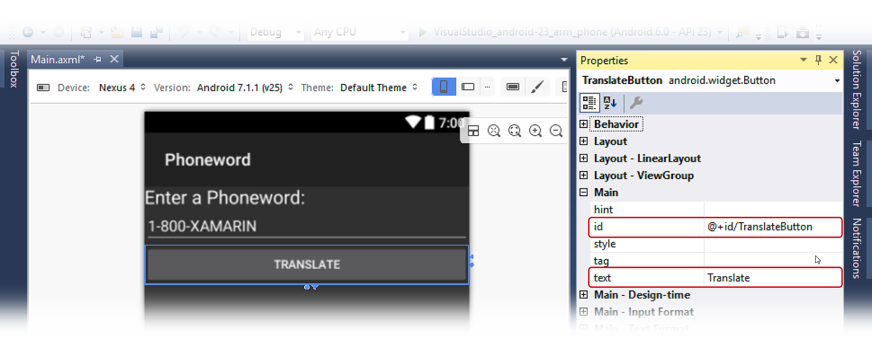 When you set the id property of the TranslateButton, the Android Designer maps the TranslateButton control to the Resource class and assigns it a resource ID of TranslateButton. This mapping of visual control to class makes it possible to locate and use the TranslateButton and other controls in app code. This will be covered in more detail when you break apart the code that powers the controls. All you need to know for now is that the code representation of a control is linked to the visual representation of the control in the designer via the id property.