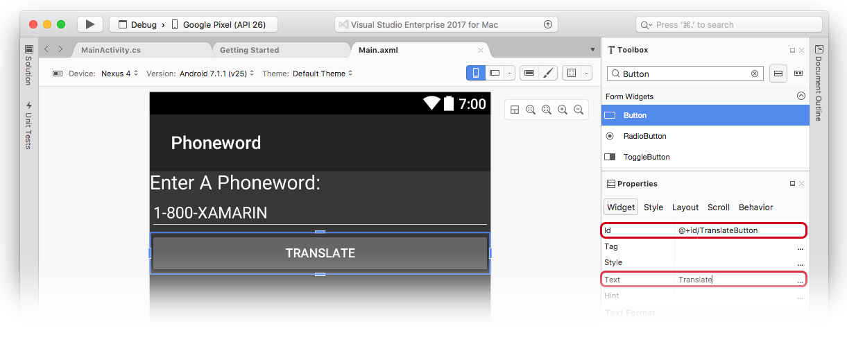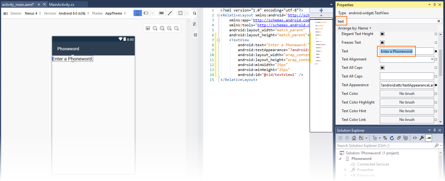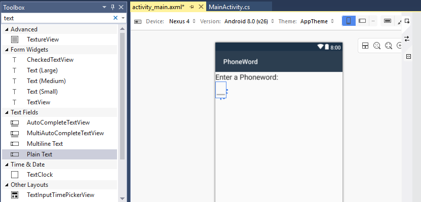Drag a TextView from the Toolbox to the design surface and place it under the Button widget. With the TextView selected, set the id property of the TextView to @+id/TranslatedPhoneWord and change the text to an empty string: