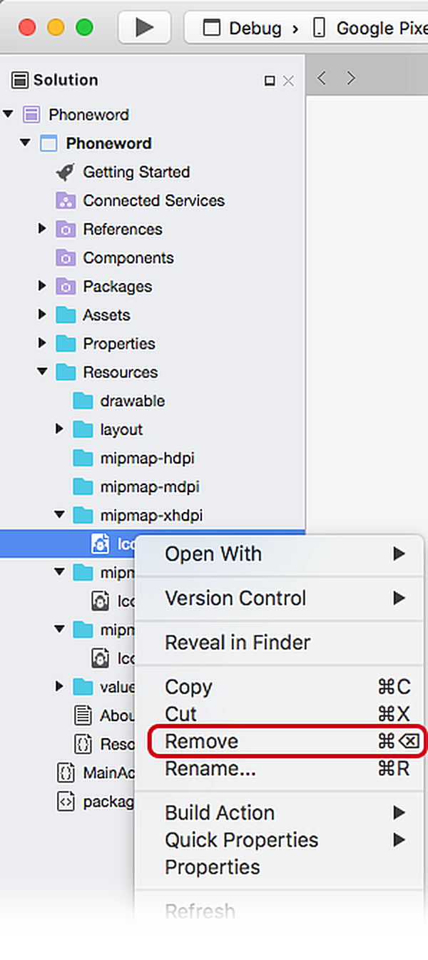 Repeat these steps for each of the mipmap- folders until the contents of the mipmap- Xamarin App Icons folders are copied to their counterpart mipmap- folders in the Phoneword project.