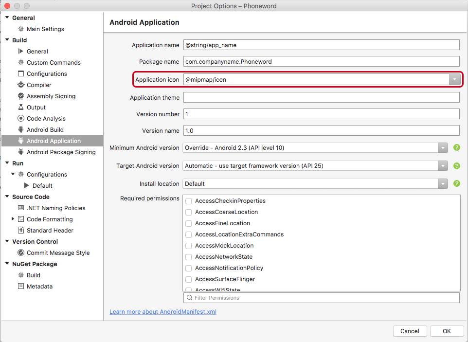 After all the icons are copied to the Xamarin.Android project, open the Project Options dialog by right clicking on the project in the Solution Pad. Select Build > Android Application and select @mipmap/icon from the Application icon combo box: