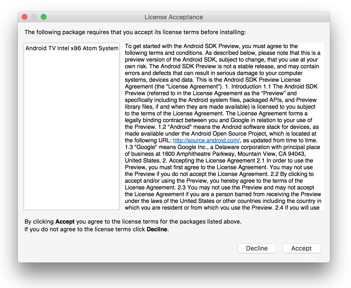 A dialog may be shown with the message, The following package requires that you accept its license terms before installing: