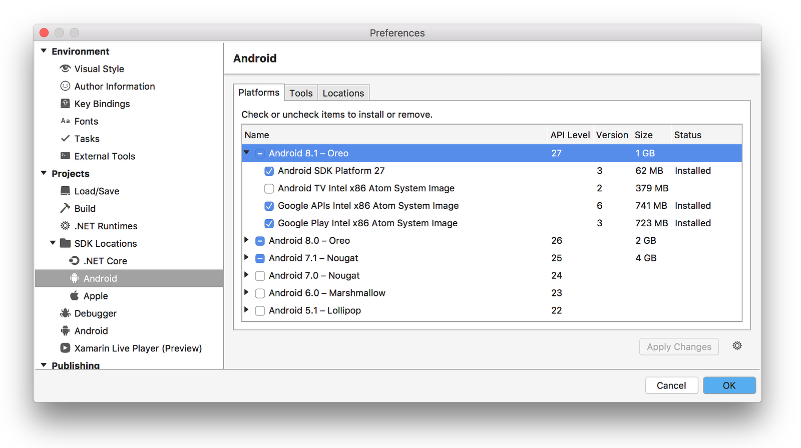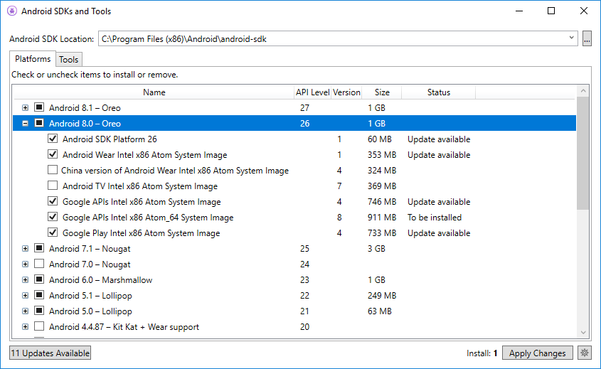 To add another platform to the SDK, click the box next to the platform until the checkmark appears to install all of its components, then click Apply Changes: