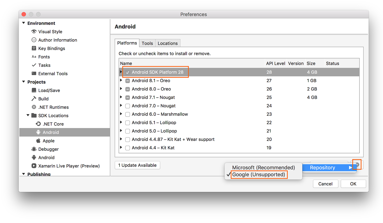 By default, the Android SDK Manager downloads platform components and tools from a Microsoft-managed repository. If you need access to experimental alpha/beta platforms and tools that are not yet available in the Microsoft repository, you can switch the SDK Manager to use Google's repository. To make this switch, click the gear icon in the lower right-hand corner and select Repository > Google (Unsupported):