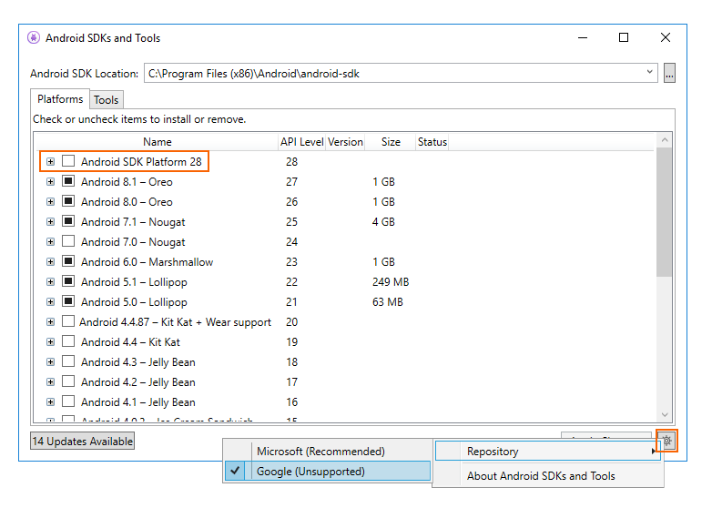 When the Google repository is selected, additional packages may appear in the Platforms tab that were not available previously. (In the above screenshot, Android SDK Platform 28 was added by switching to the Google repository.) Keep in mind that use of the Google repository is unsupported and is therefore not recommended for everyday development.