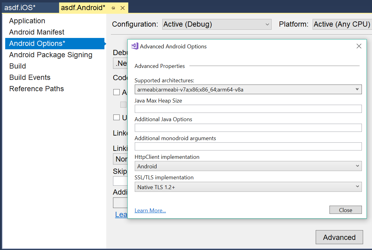 The above summary explains the project-level settings for HttpClient and SSL/TLS implementation in Xamarin Projects. The HttpClient implementation can also be set dynamically in code. Refer to these platform-specific guides for more information: