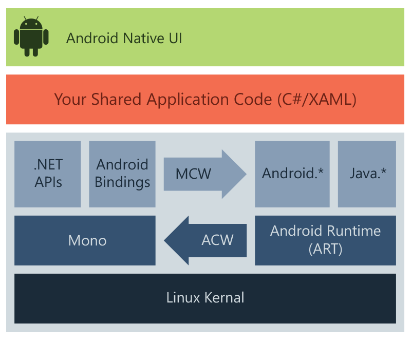 Xamarin.Android applications compile from C# into Intermediate Language (IL) which is then Just-in-Time (JIT) compiled to a native assembly when the application launches. Xamarin.Android applications run within the Mono execution environment, side by side with the Android Runtime (ART) virtual machine. Xamarin provides .NET bindings to the Android.* and Java.* namespaces. The Mono execution environment calls into these namespaces via Managed Callable Wrappers (MCW) and provides Android Callable Wrappers (ACW) to the ART, allowing both environments to invoke code in each other.