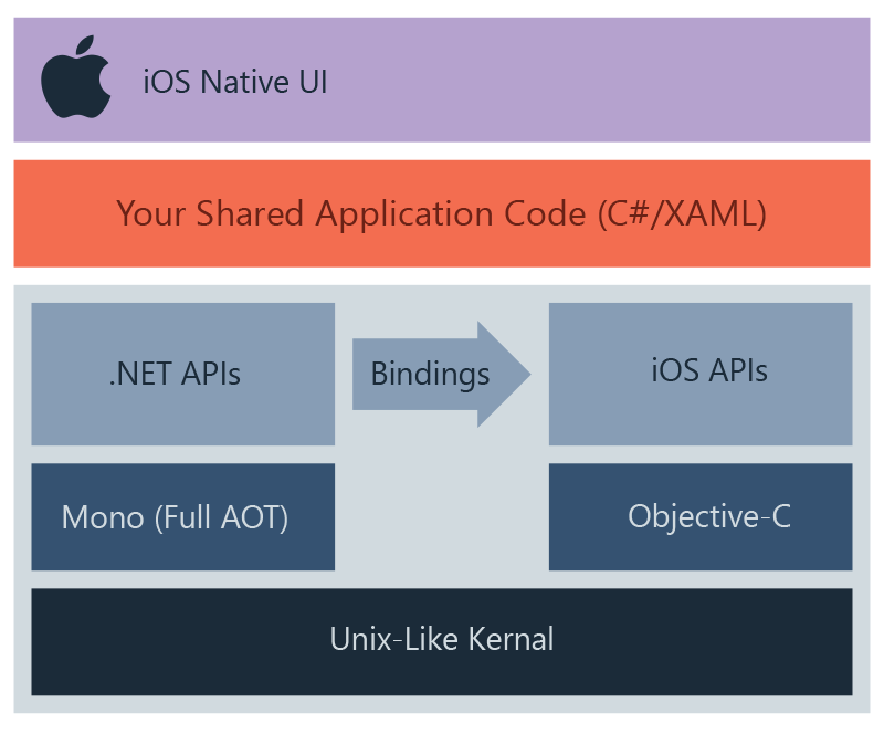 Xamarin.iOS applications are fully Ahead-of-Time (AOT) compiled from C# into native ARM assembly code. Xamarin uses Selectors to expose Objective-C to managed C# and Registrars to expose managed C# code to Objective-C. Selectors and Registrars collectively are called "bindings" and allow Objective-C and C# to communicate.