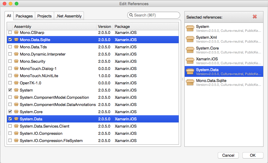 Xamarin.iOS 8.10 adds support for System.Data, including the Mono.Data.Sqlite.dll ADO.NET provider. Support includes the addition of the following assemblies: