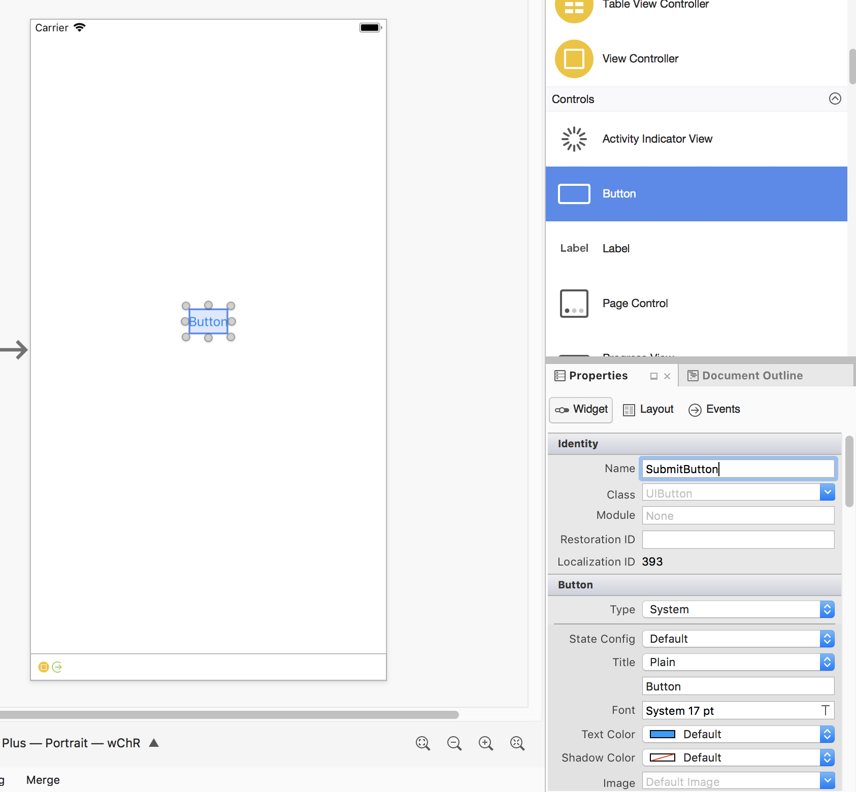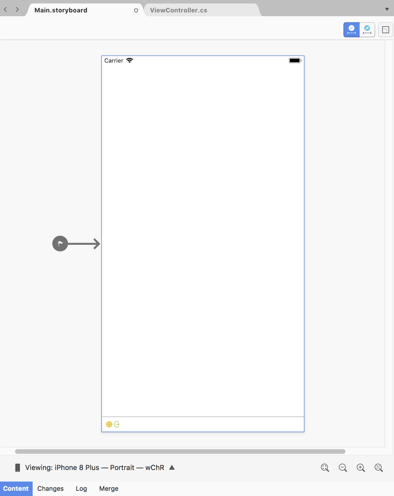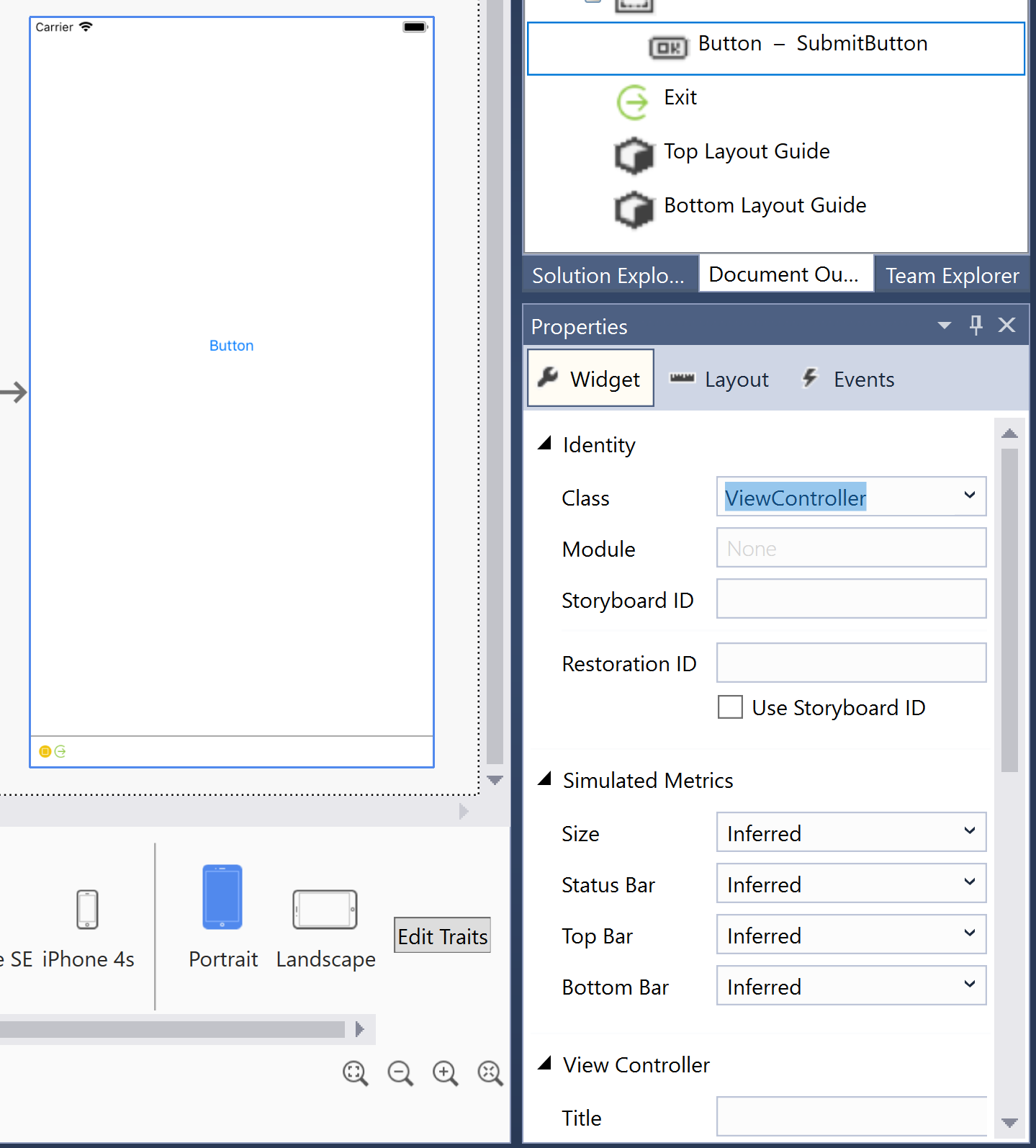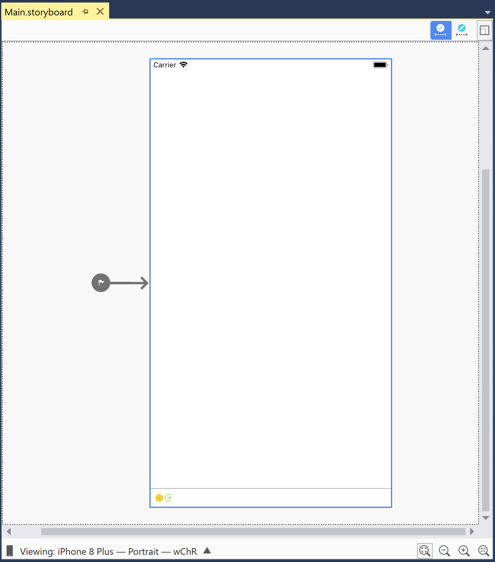 - Bottom Toolbar – Contains options for changing how the iOS Designer displays the .storyboard or .xib file, including device, orientation, and zoom.