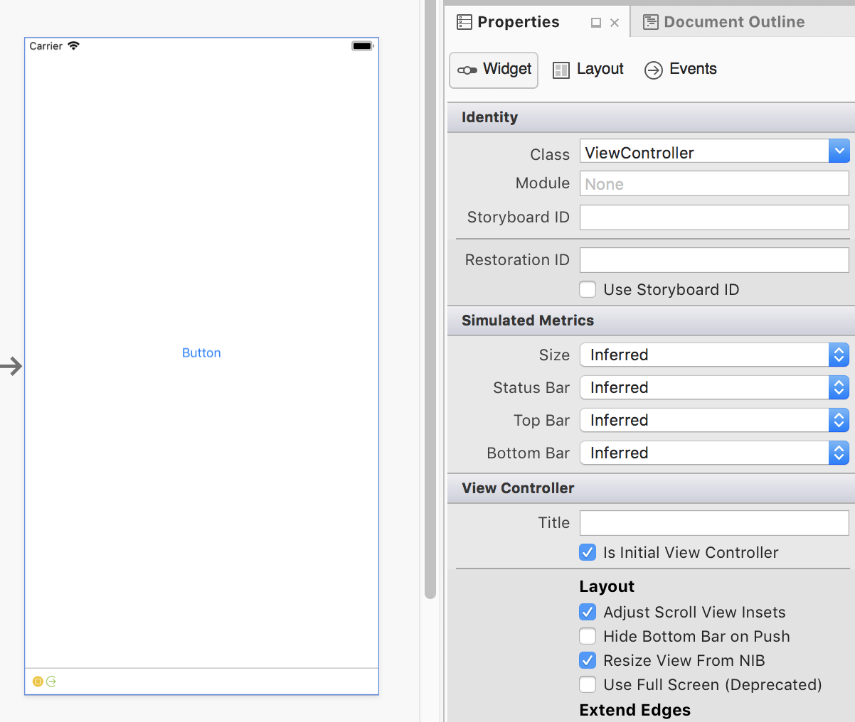The iOS Designer can also display an interface's hierarchy of controls as an outline. The outline is available by selecting the Document Outline tab, as shown below: