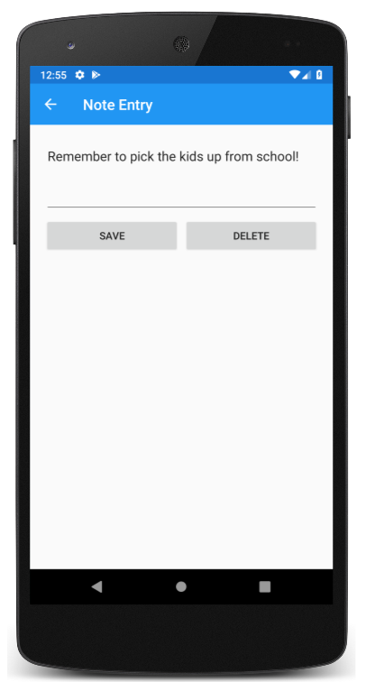 The NavigateToNoteEntryPage method converts the Xamarin.Forms ContentPage-derived page to a Fragment with the CreateSupportFragment extension method, and adds the Fragment to the fragment back stack. Therefore, the UI defined in the Xamarin.Forms NoteEntryPage will be displayed, as shown in the following screenshot: