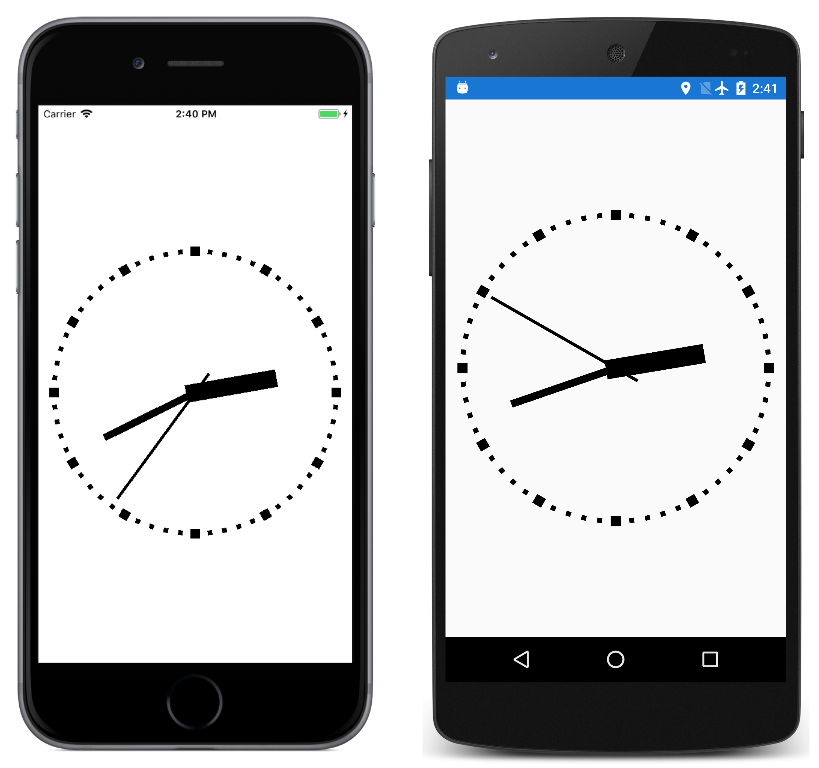 Because Xamarin.Forms does not have a built-in vector graphics system, the BoxView helps to compensate. Some of the sample programs described in this article use BoxView for rendering graphics. The BoxView can be sized to resemble a line of a specific width and thickness, and then rotated by any angle using the Rotation property.