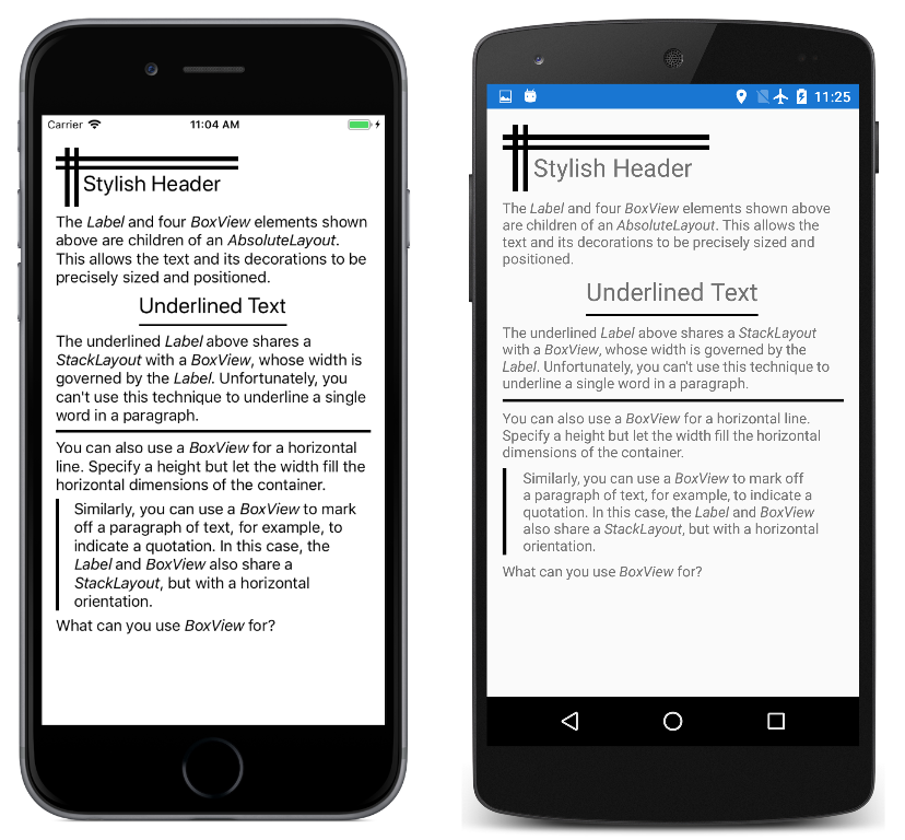 You can use the BoxView to add some simple decorations on your pages in the form of horizontal and vertical lines. The sample demonstrates this. All of the program's visuals are defined in the MainPage.xaml file, which contains several Label and BoxView elements in the StackLayout shown here: