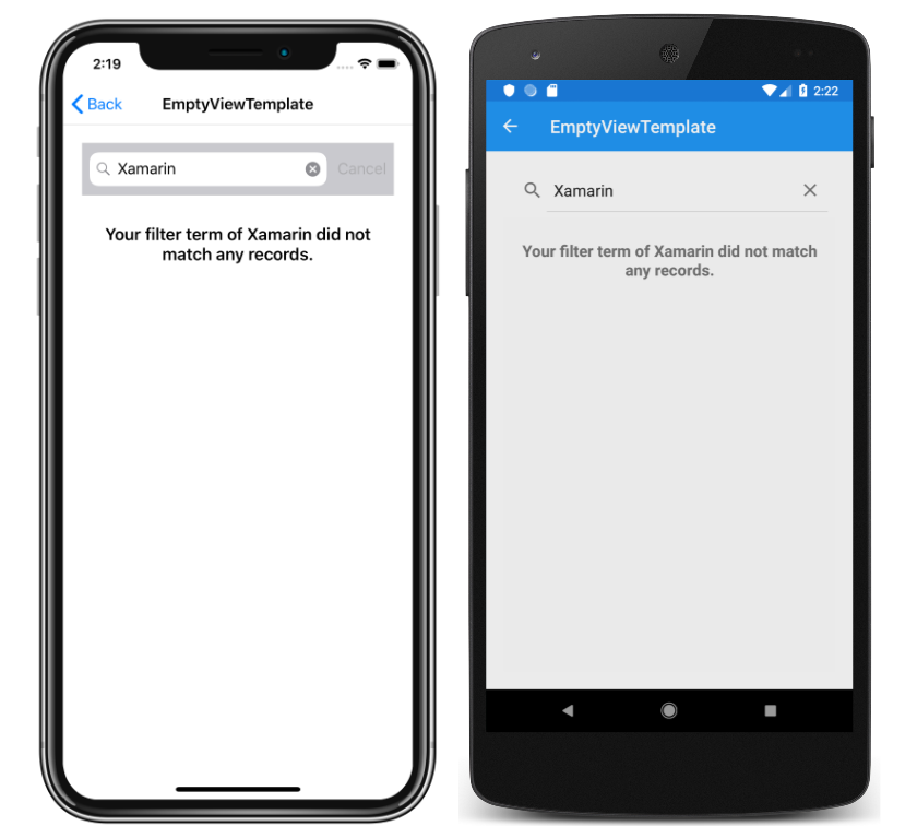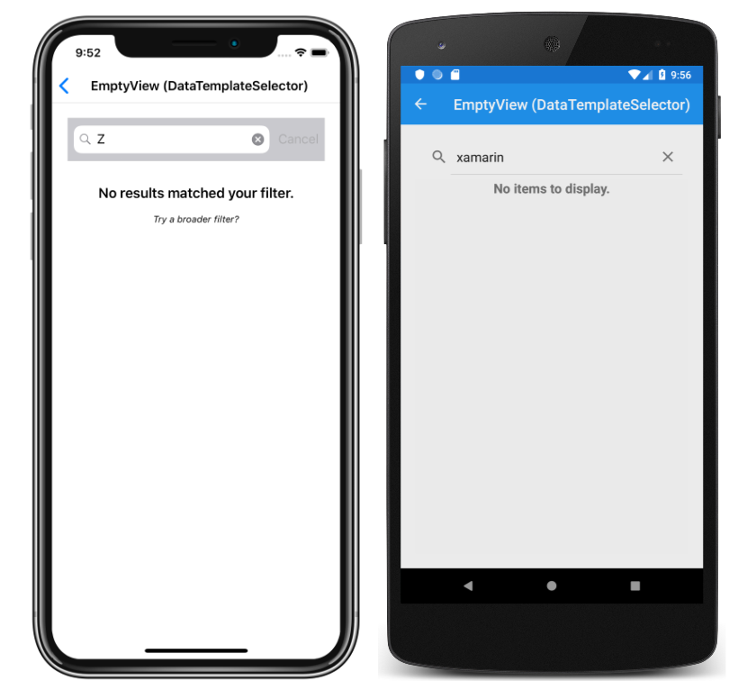 The EmptyView property is set to a FilterData object, and the Filter property data binds to the SearchBar.Text property. When the SearchBar executes the FilterCommand, the collection displayed by the CollectionView is filtered for the search term stored in the Filter property. If the filtering operation yields no data, the Label defined in the DataTemplate, that's set as the EmptyViewTemplate property value, is displayed: