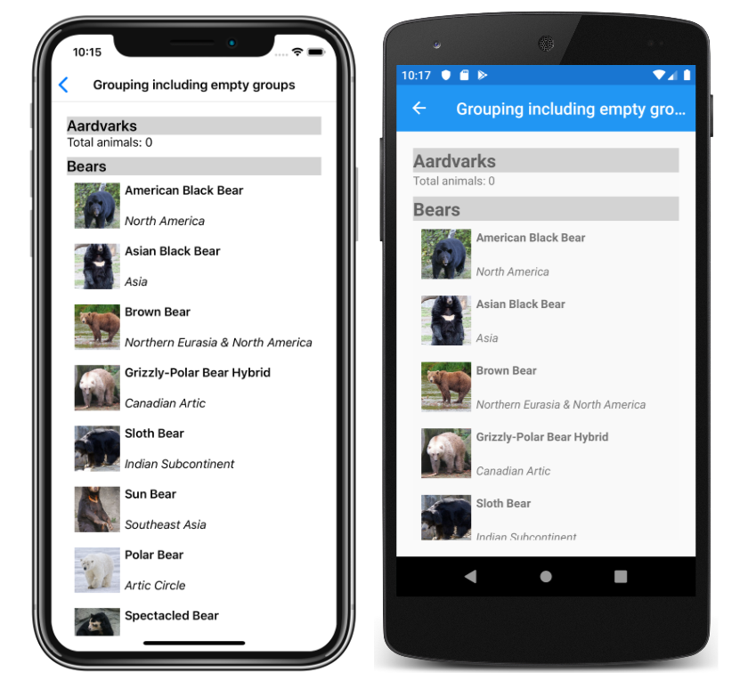 When a CollectionView displays grouped data, it will display any groups that are empty. Such groups will be displayed with a group header and footer, indicating that the group is empty. The following screenshots show an empty group: