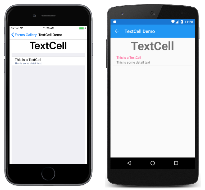 A TextCell displays one or two text strings. Set the Text property and, optionally, the Detail property to these text strings.API Documentation / Guide |