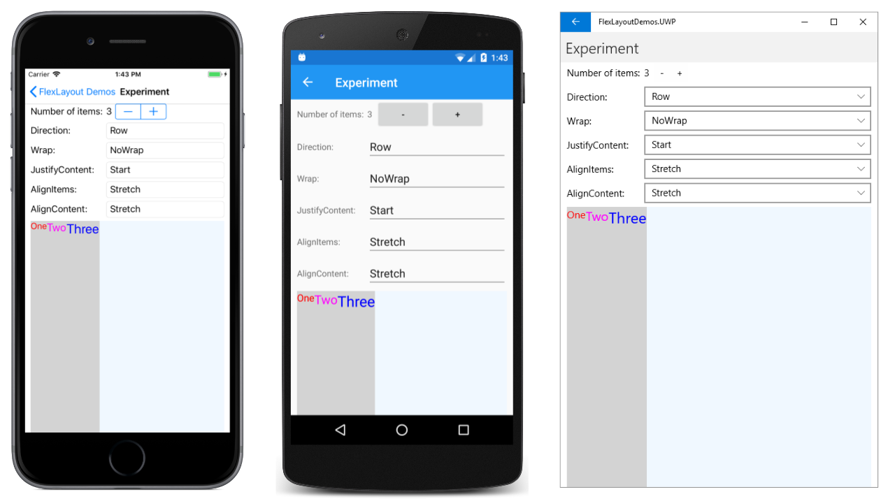 In the iOS screenshot, both rows are at the top; in the Android screenshot they're in the center; and in the UWP screenshot they're at the bottom. The rows can also be spaced in various ways: