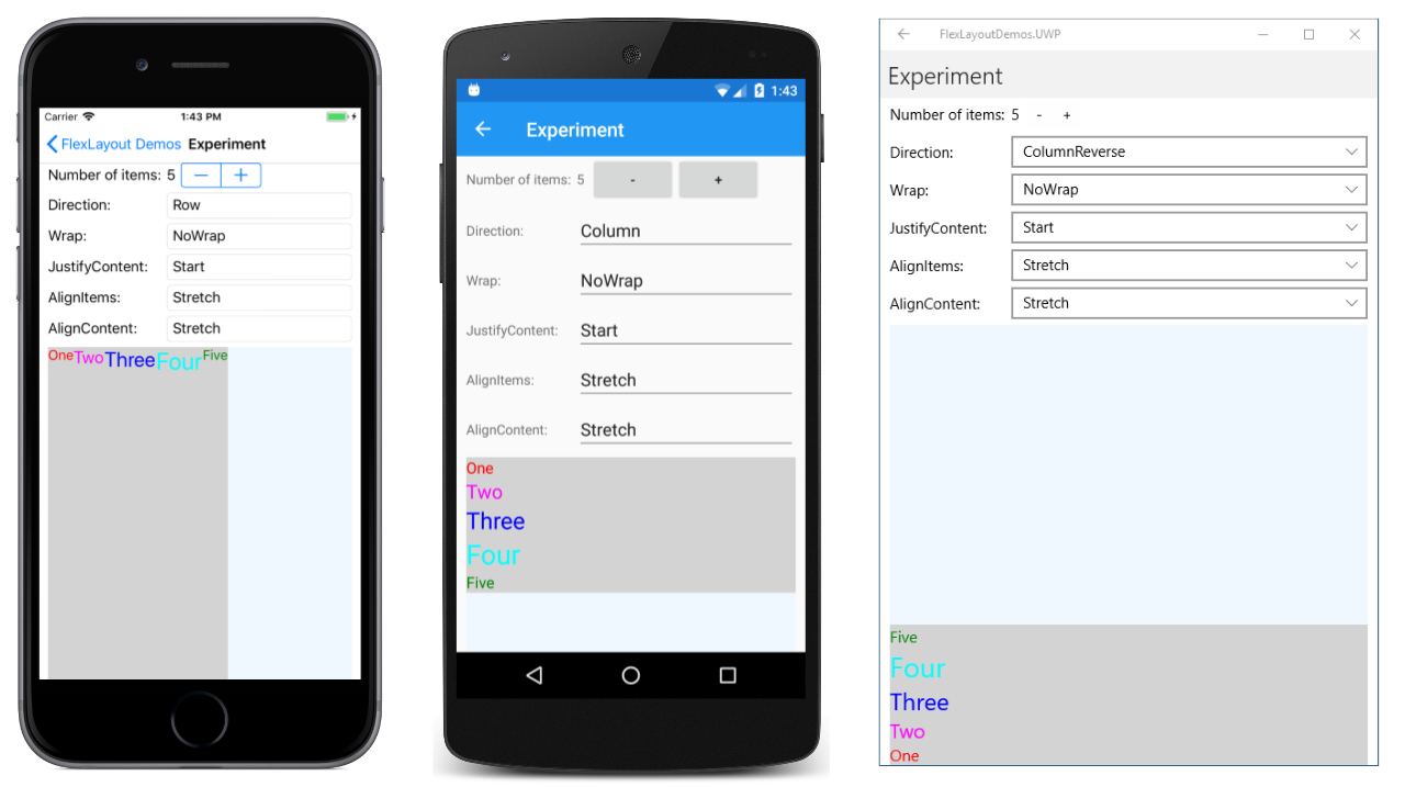 The iOS screenshot at the left shows the two Label elements being given heights in device-independent units. The Android screen shows them being given heights that are a fraction of the total height of the FlexLayout. If the Basis is set at 100%, then the child is the height of the FlexLayout, and will wrap to the next column and occupy the entire height of that column, as the UWP screenshot demonstrates: It appears as if the five children are arranged in a row, but they're actually arranged in five columns.