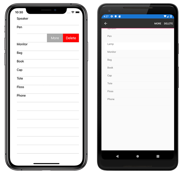 ListViewdown to refresh the contents. - Context actions allow the developer to specify custom actions on individual list items. For example, you can implement swipe-to-action on iOS, or long-tap actions on Android.