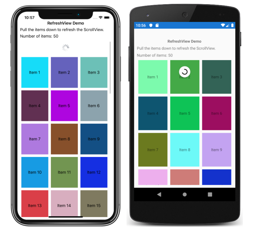 In this example, the RefreshView provides pull to refresh functionality to a ScrollView whose child is a FlexLayout. The FlexLayout uses a bindable layout to generate its content by binding to a collection of items, and sets the appearance of each item with a DataTemplate. For more information about bindable layouts, see Bindable Layouts in Xamarin.Forms.