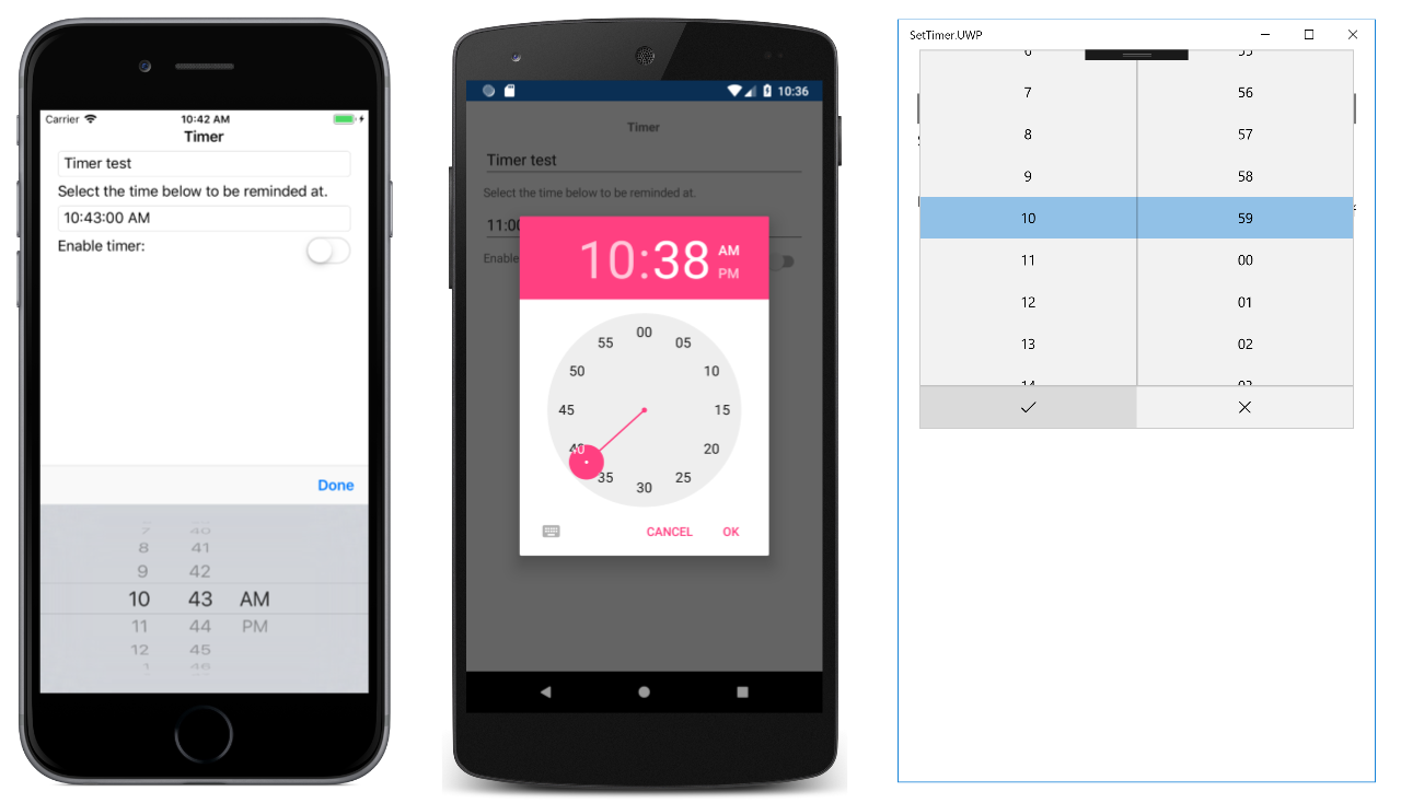 When the sample is first run, the TimePicker view is initialized to 11am. Tapping the TimePicker invokes the platform time picker. The platforms implement the time picker in very different ways, but each approach is familiar to users of that platform: