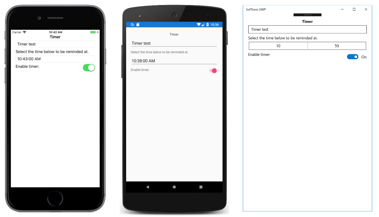 The sample includes TimePicker, Entry, and Switch views on its page. The TimePicker can be used to select a time, and when that time occurs an alert dialog is displayed that reminds the user of the text in the Entry, provided the Switch is toggled on. Here's the XAML file: