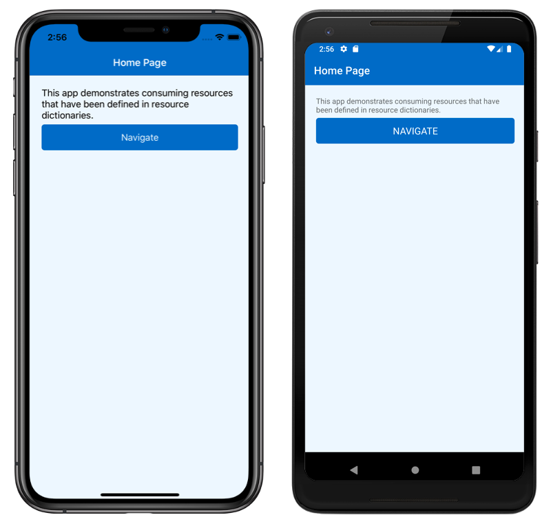 In this example, the resource dictionary defines a Thickness resource, multiple Color resources, and two implicit Style resources. For more information about the App class, see Xamarin.Forms App Class.