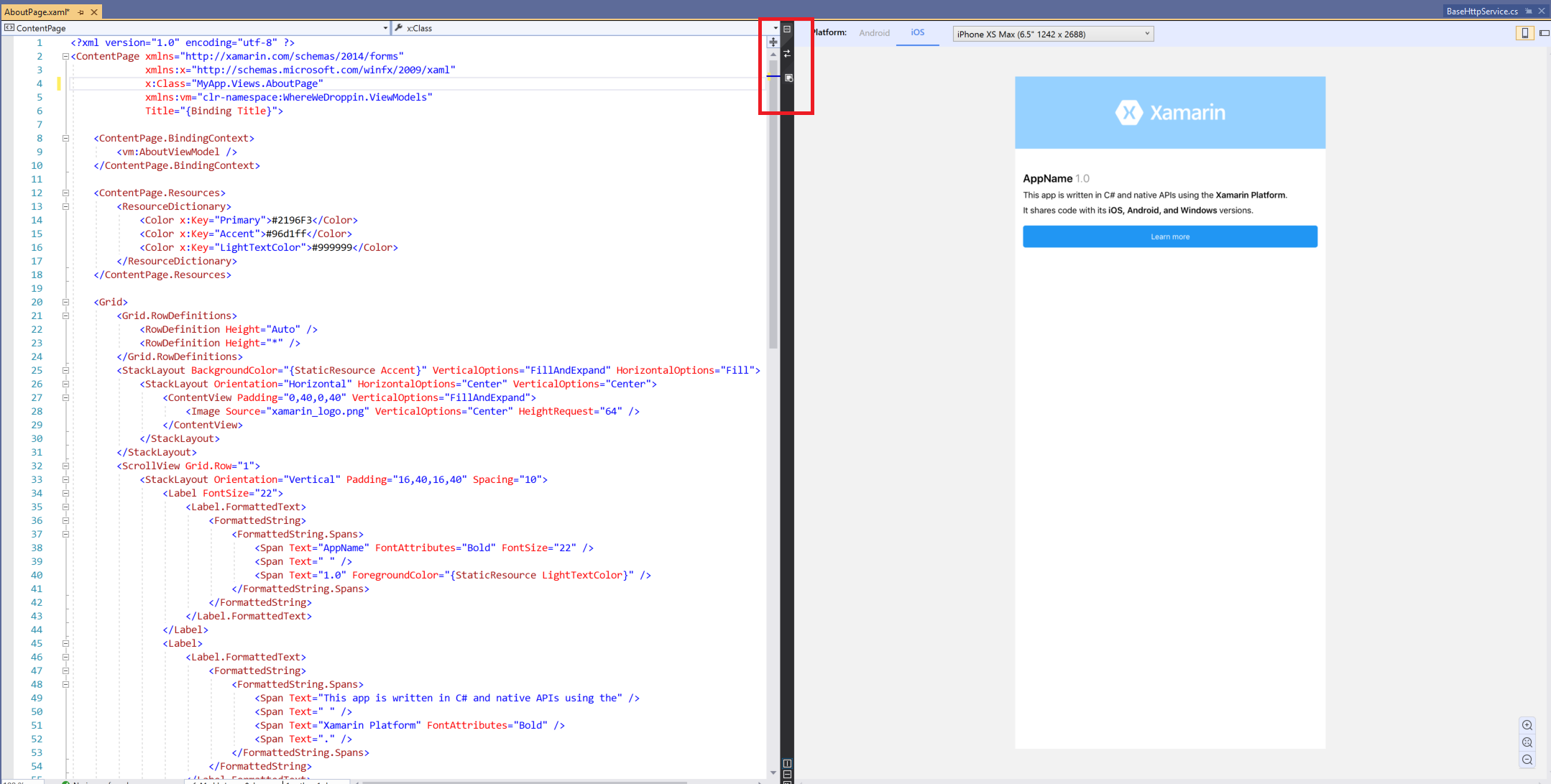 The XAML Previewer shows you how your Xamarin.Forms XAML page will look on iOS and Android. When you make changes to your XAML, you'll see them previewed immediately alongside your code. The XAML Previewer is available in Visual Studio and Visual Studio for Mac.