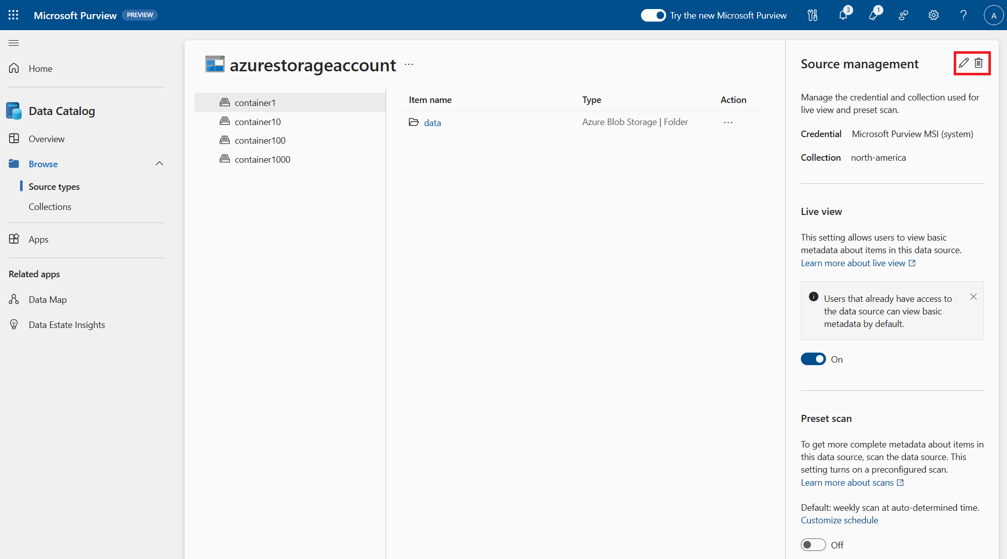 Live view resources in the same tenant as your Microsoft Purview account are automatically accessible for users in your catalog. These resources have live view available: