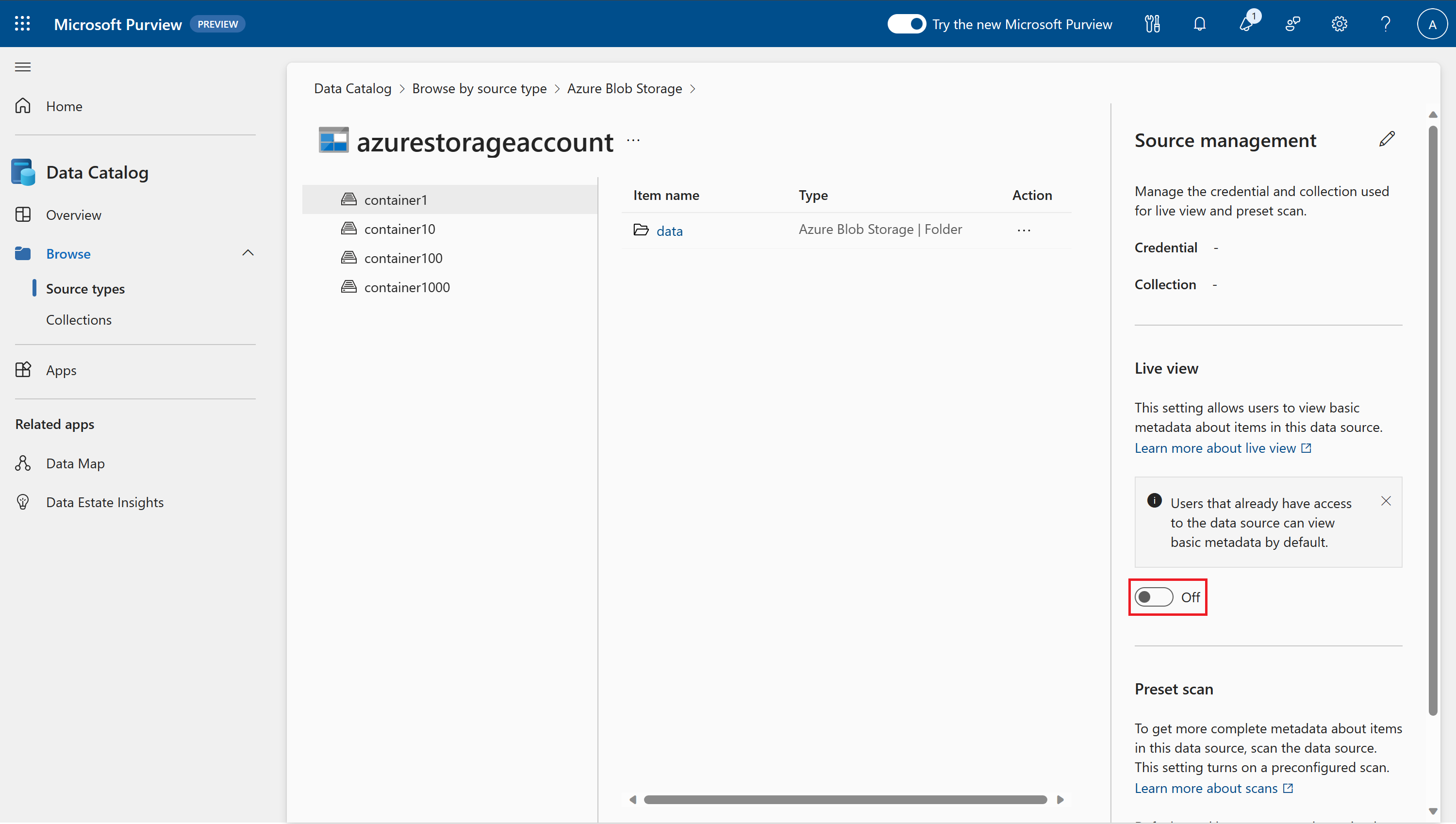 Assets with a live view allow data source administrators to perform preset scans. A live view asset has only some of it's metadata automatically available to users. A preset scan gathers the rest of that metadata and makes it available in Microsoft Purview.