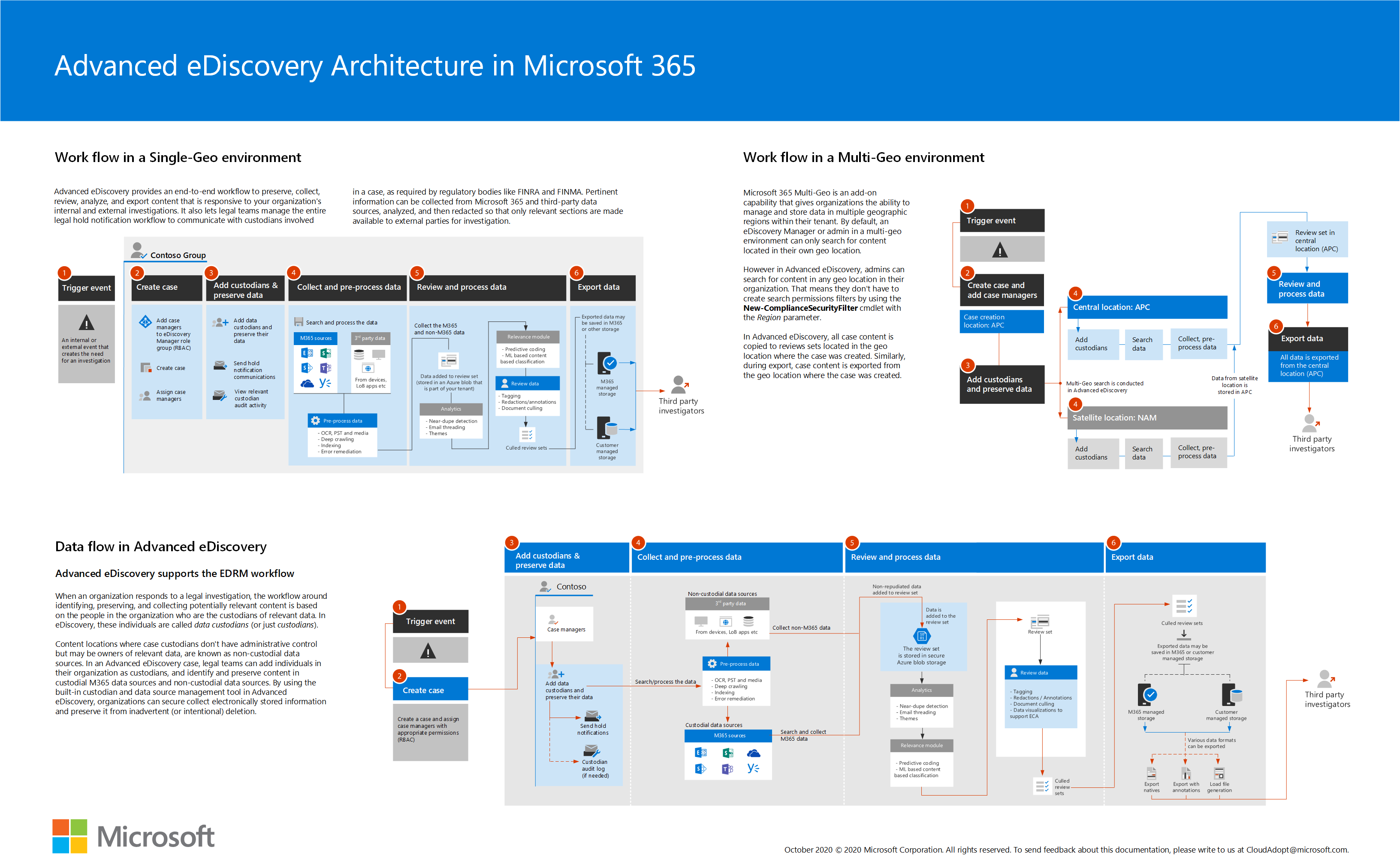 Here's an architecture diagram that shows the eDiscovery (Premium) end-to-end workflow in a single-geo environment and in a multi-geo environment, and the end-to-end data flow that's aligned with the Electronic Discovery Reference Model.