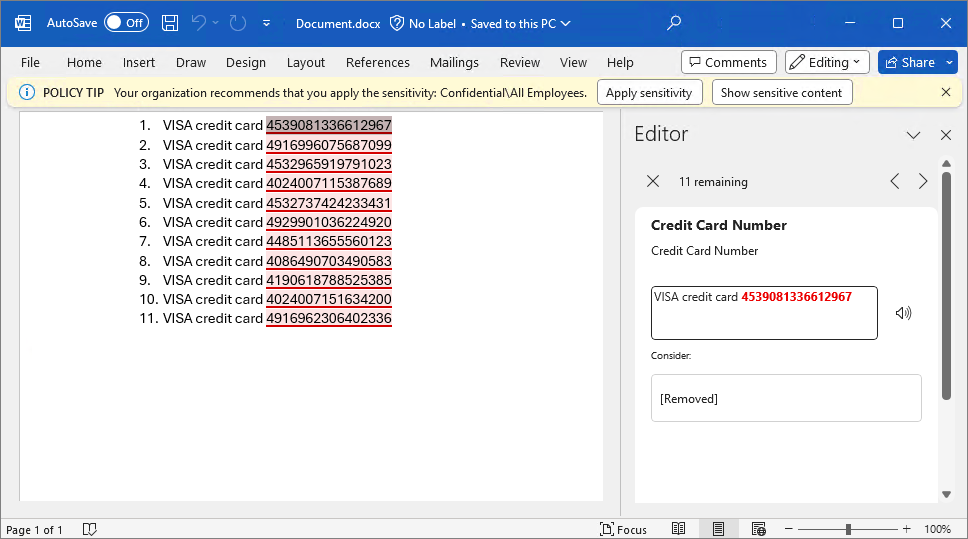 2. Recommend Confidential \ All Employees if 10+ credit card numbers