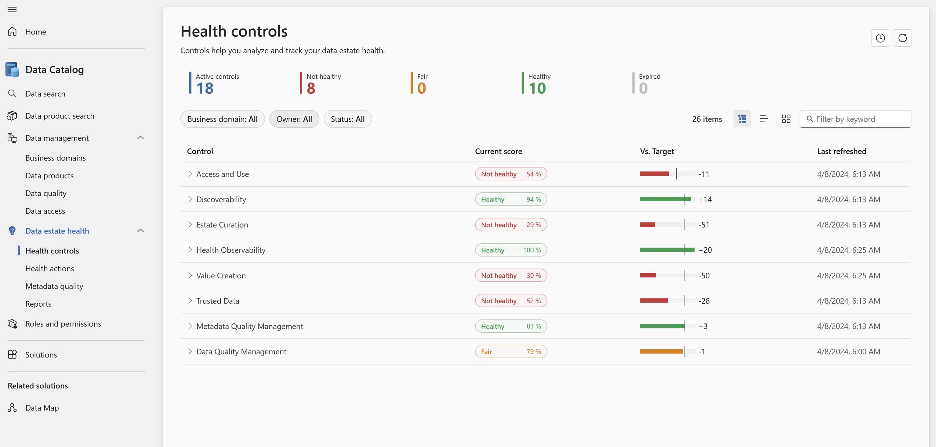 If you're a data health owner, you can edit controls and change the preset health ranges and thresholds to customize how you measure the success of your data estate. You can also edit the schedule for the overall data refresh rate for all active controls. For more information, see the Health management controls article.