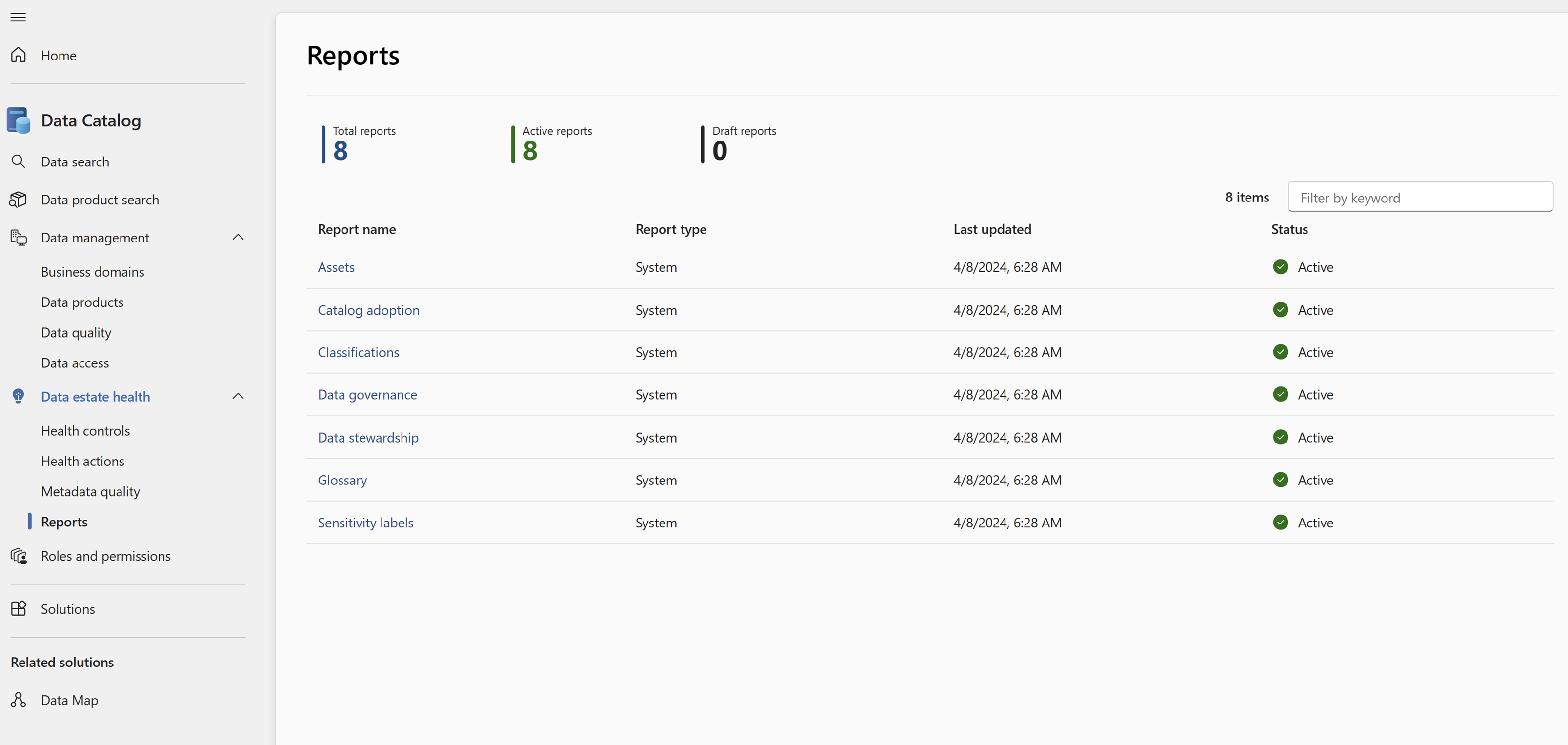 Data analysts and stewards in the federated data governance office can view built-in reports for deeper analysis of the data estate. These reports give summaries of individual business concepts like governance domains or data products. They also address data governance goals, catalog adoption, and asset information like classification. For more information, see the health management reports article.