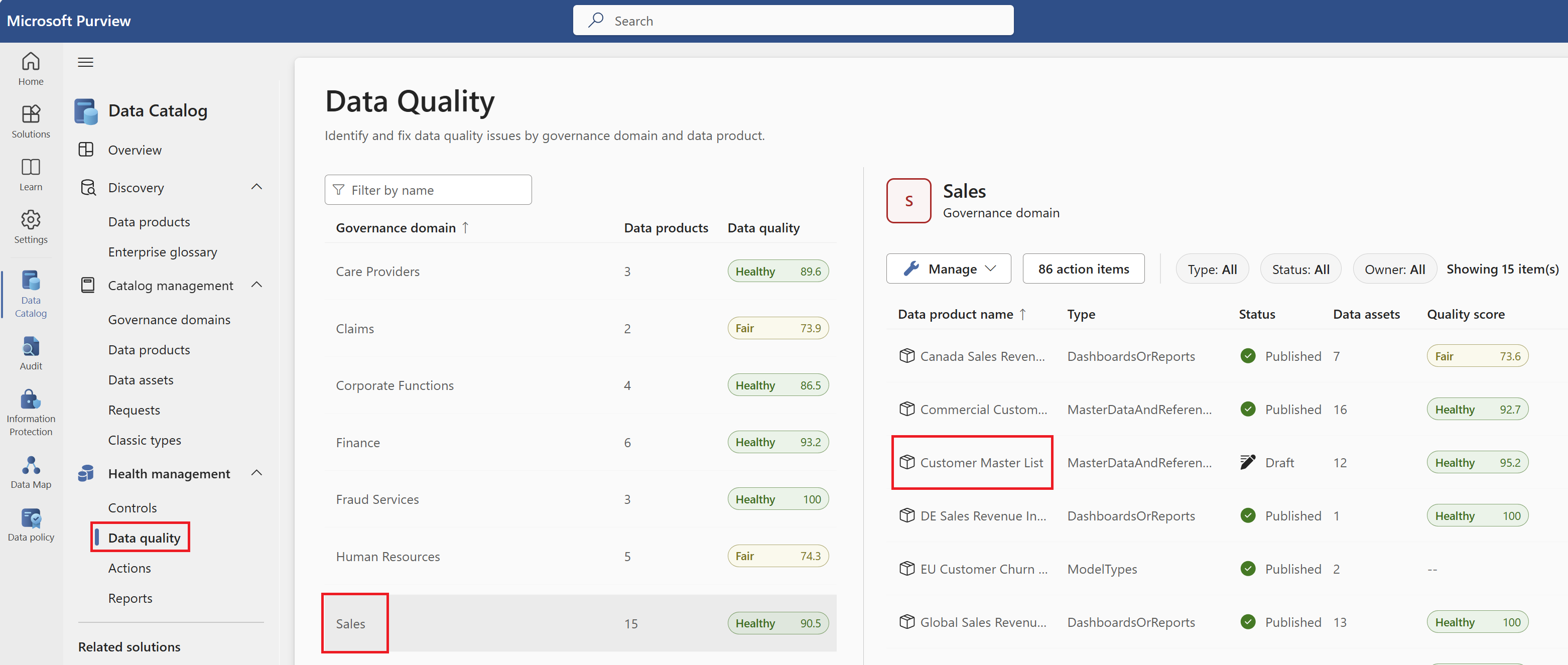 From Microsoft Purview Unified Catalog, select the Health Management menu and Data quality submenu.