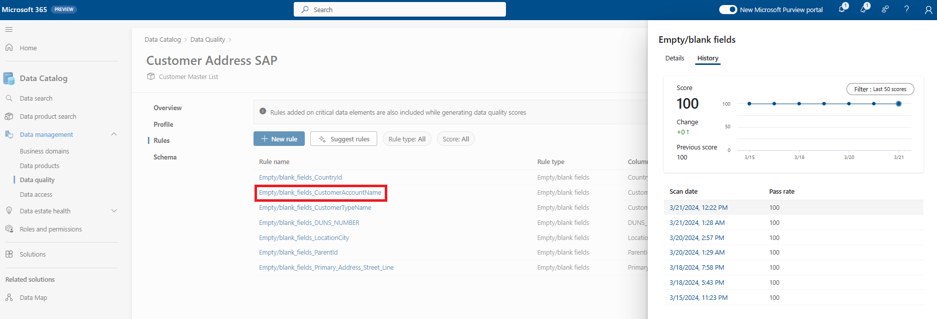 Select a rule to browse the performance history of the applied rule to the selected data asset.