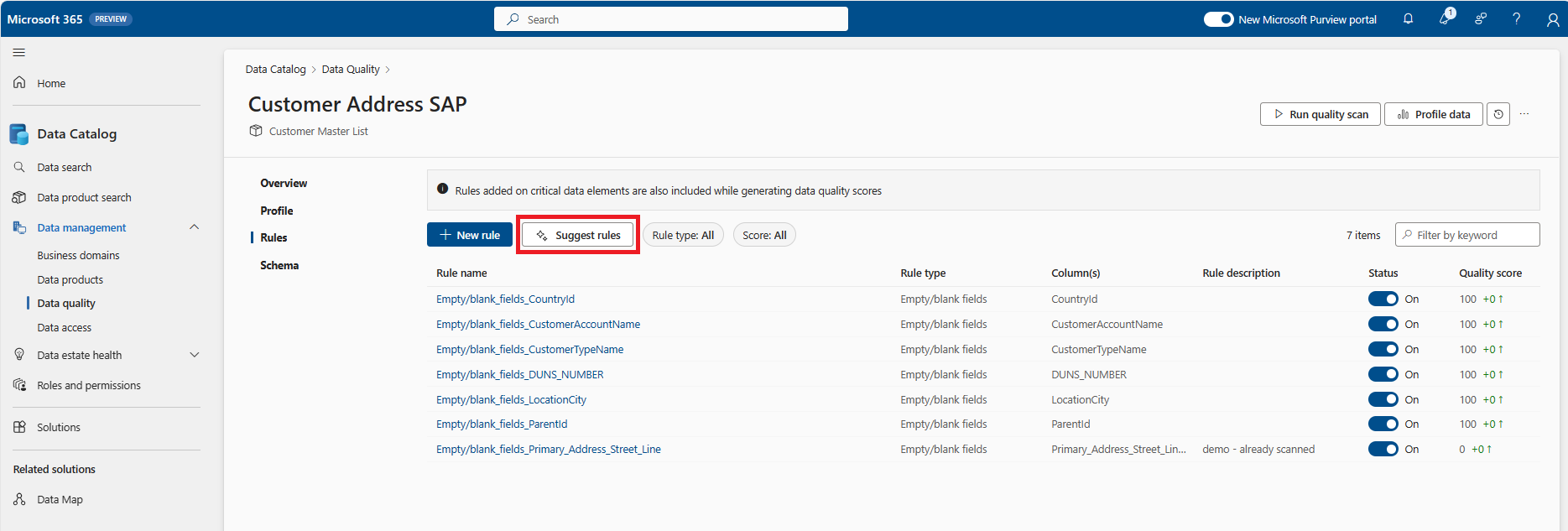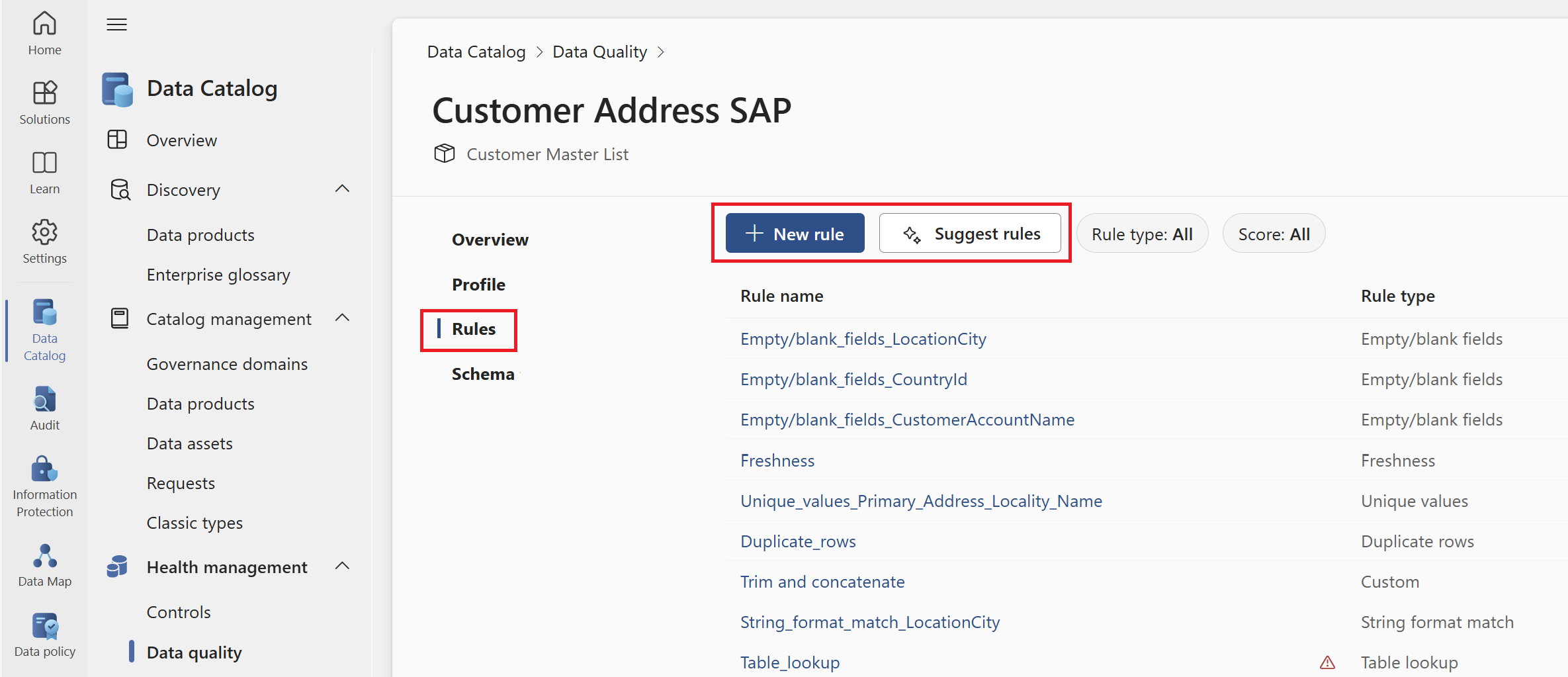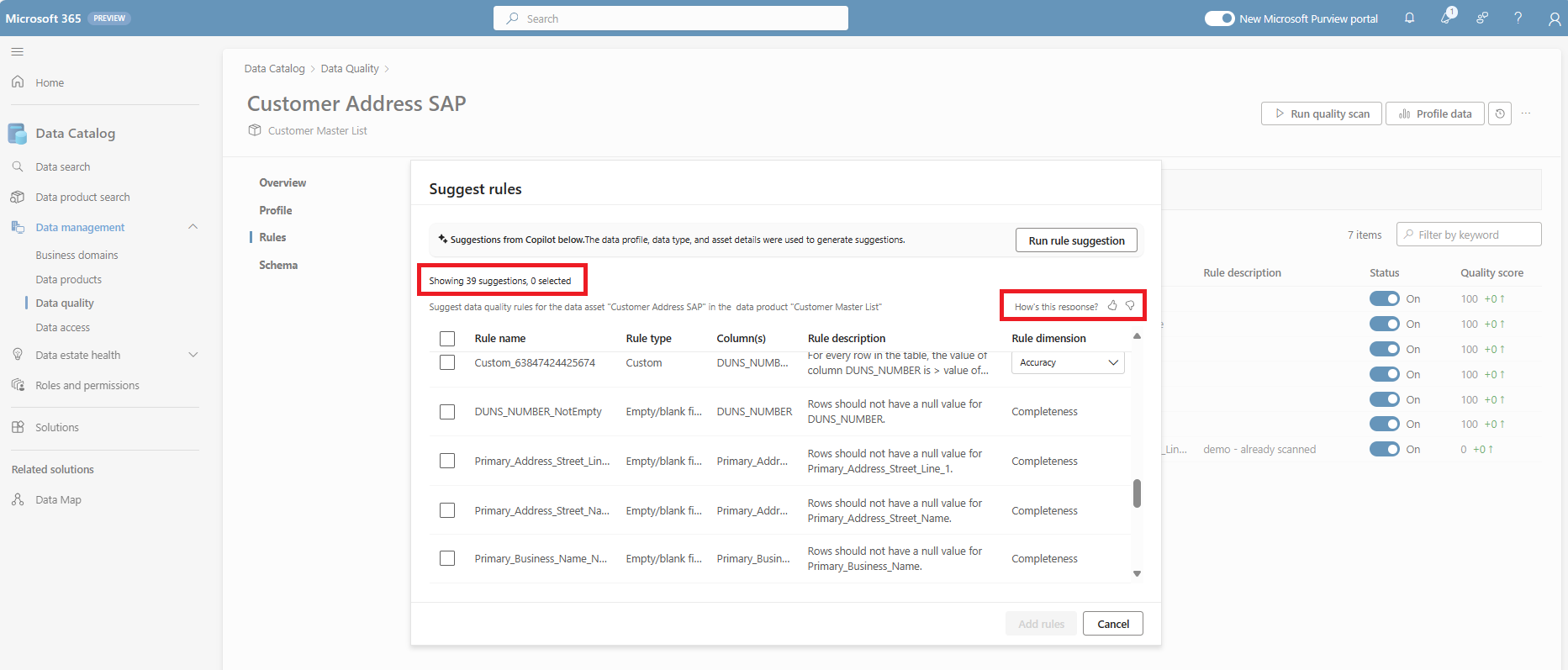 - Select rules from the suggested rule list to apply to the data asset.