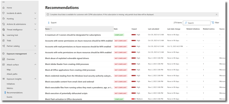 In the Microsoft Defender portal, select Exposure management > Exposure insights > Recommendations to open the Recommendations page.