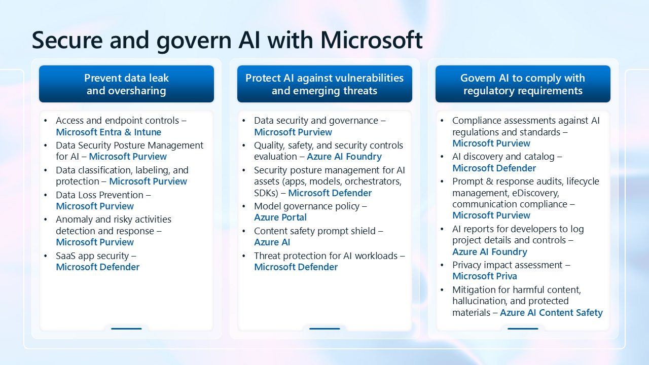| Protect AI against vulnerabilities and emerging threats | - Data security and governance — Microsoft Purview - Quality, safety, and security controls evaluation — Azure AI Foundry - Security posture management for AI assets (apps, models, orchestrators, SDKs) — Microsoft Defender - Model governance policy — Azure Portal - Content safety prompt shield — Azure AI - Threat protection for AI workloads — Microsoft Defender |