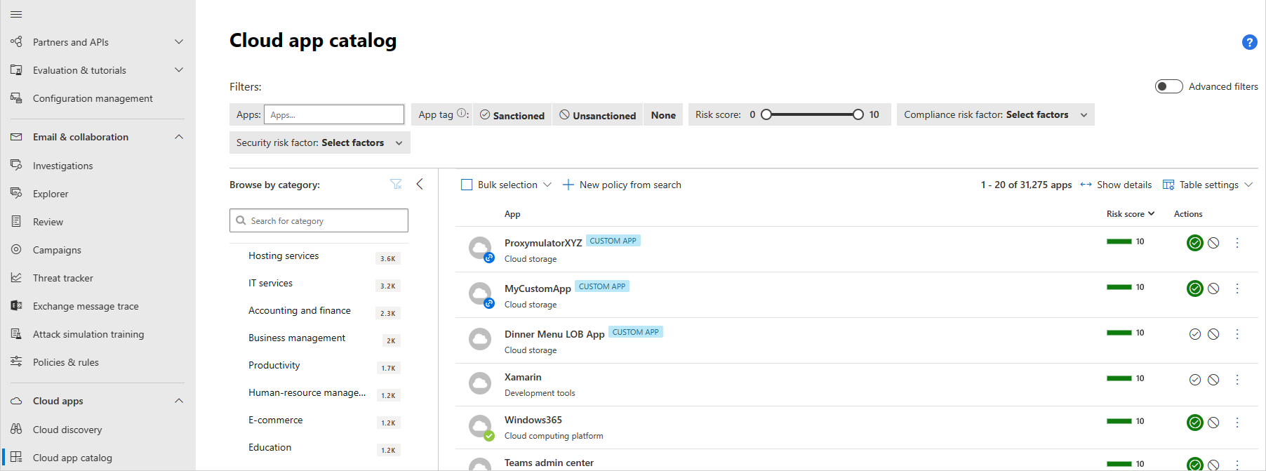 | Assess the risk score for newly discovered apps | Cloud app catalog and risk scores |