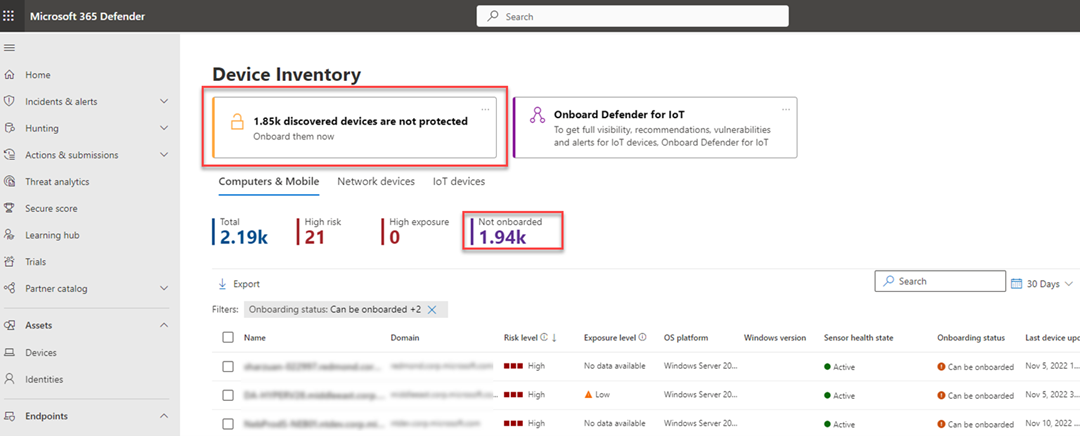 For example, within Microsoft Defender XDR, the device inventory provides a clear view into newly discovered devices in your network that aren't yet protected. At the top of each Device inventory tab, you can see the total number of devices that aren't onboarded. Here's an example.