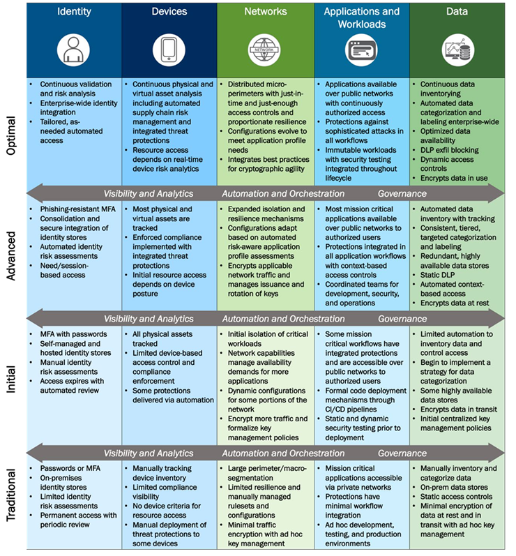 Use the following criteria to identify the maturity stage for Zero Trust technology pillars and provide consistency across the model: