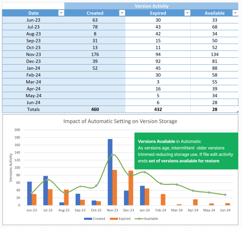 Take an example of file with a consistent version creation pattern between the months of June until January. Under Automatic setting, intermittent versions are purged as the versions age resulting in ~94% reduction in version storage used compared to applying count limits only.