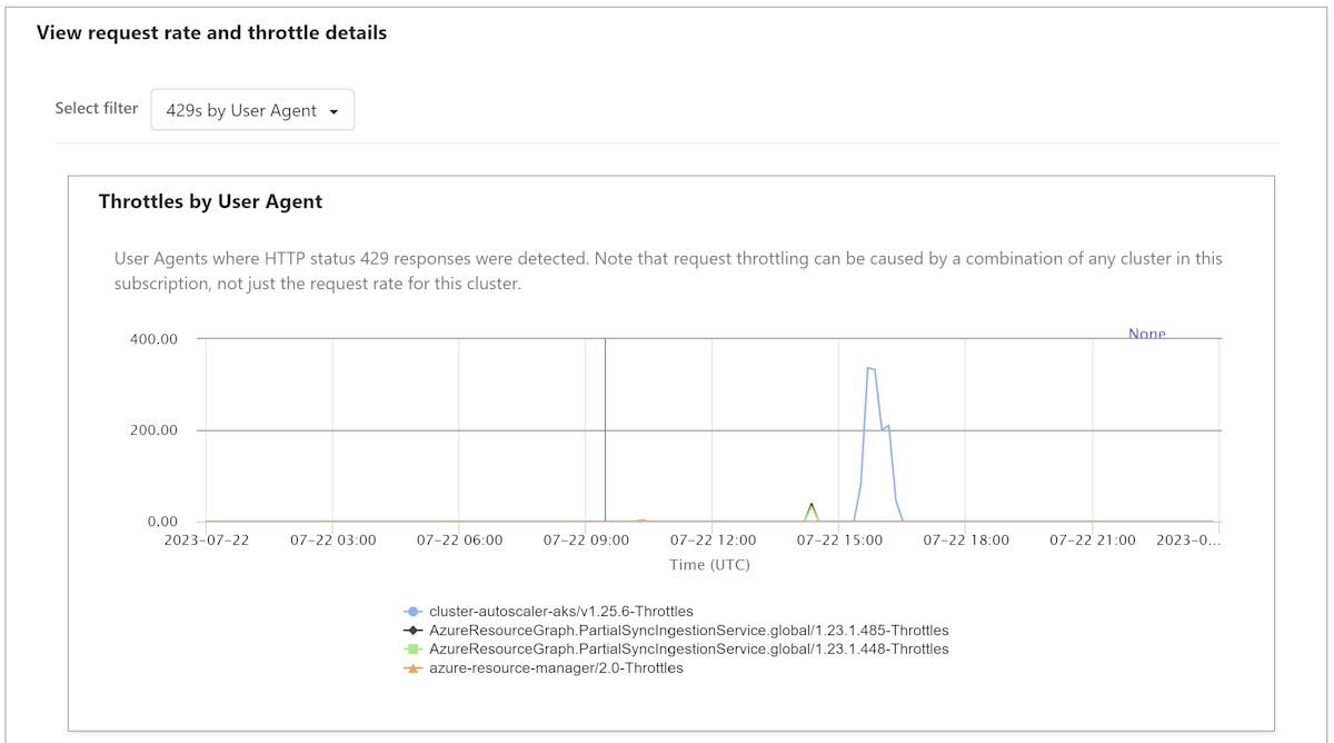 You can check the View request rate and throttle details diagnostic to find the throttling details. Select 429s by User Agent from the Select filter drop-down list, and you can see that autoscaler requests are throttled from 15:00 to 16:00.