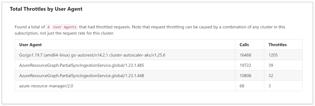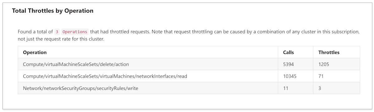 • Request Rate Throttling has been detected for your Cluster: This diagnostic provides some general recommendations if throttling has been detected in the current AKS cluster.