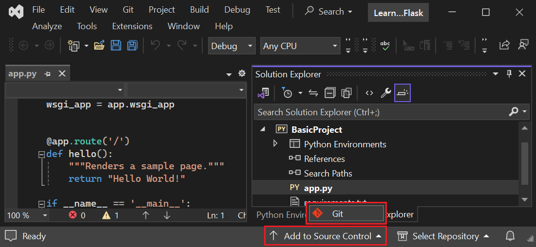 In the next procedure, you familiarize yourself with Visual Studio support for Git source control.