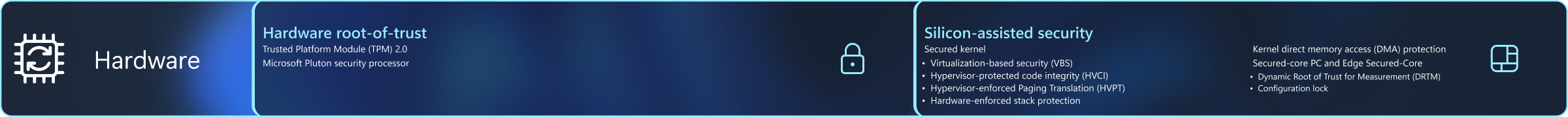 In partnership with our silicon and device manufacturing partners, Windows 11 devices shield software, hardware, and firmware with features like Trusted Platform Module (TPM) 2.0, Microsoft Pluton, and Virtualization-based security (VBS). Windows 11 devices provide hardware-backed protection by default to significantly improve security while maintaining the performance that users expect.