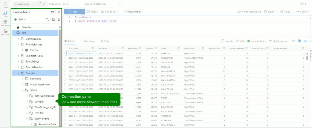 In het verbindingsvenster aan de linkerkant van de querypagina kunt u bladeren en schakelen tussen uw clusters en databases. Onder elk cluster ziet u de databases die in dat cluster zijn opgenomen. Onder elke database ziet u de tabellen, functies, externe tabellen en gerealiseerde weergaven in die database.