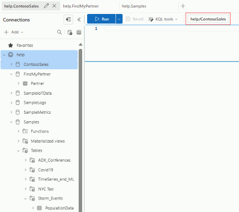 Gebruik de queryeditor om met uw gegevens te communiceren door query's uit te voeren in de context van een specifieke database. Als u de querycontext wilt instellen, selecteert u de relevante database in het linkerdeelvenster. De querycontext wordt weergegeven in de bovenste werkbalk.